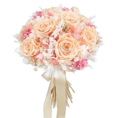 $180 – 4 blooms of white preserved David Austin Roses, 5 stalks of Garden Roses (white, pink, cappuccino), completed with Baby roses, Astrantia, Eustomas Ammi Maju, Carnations, Dried Lavender and Eucalyptus (Silver dollar, Parvifolia).