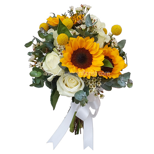 $140 - 3 stalks Sunflower, 6 stalks of Roses, complemented with Billy Button, Wax flower, and Eucalyptus (as shown)