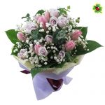 $68 – 6 stalks of Tulips complemented by Baby Roses, Baby’s Breath and foliage (Salal leaves, Eucalyptus) (as shown)