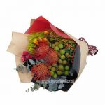 This exotic bouquet is made up of groups of wild flowers like Pin Cushions, Baubles, Hypericum Berries, South Africa Wild flowers and Eucalyptus. The bouquet is wrapped with brown paper and frosty wrapper.