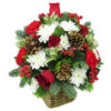 This arrangement consist of 3 Roses, 3 Carnations and 5 Pinecones, with sprinkling touches of Hypericum berries, Christmas Foliages and embellished with fanciful bows (as shown).