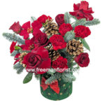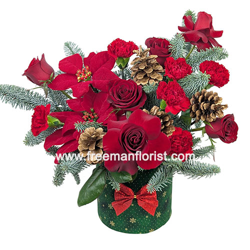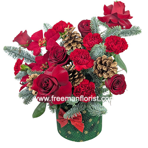 This arrangement consist of 6 Roses and 6 Carnations, complemented with various faux Christmas Ornaments and Nobilis. (as shown).