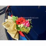 BACK – A small bouquet using 3 Roses, 2 Gerberas, fillers, leaves and decorated with a big bow of sheer material