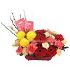 A prosperous arrangement of 1 stalk of Oriental Lily, 3 Gerberas and 2 Chrysanthemums accented with Pussy Willow, CNY Ornaments and foliage (as shown). Inclusive of a Fortune Cat Decor.