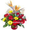 A festive mix of 3 Ping Pong Chrysanthemums, 10 Pink & Red Carnations, 1 L size Anthurium, completed with various Faux Floral decorations ( Ilex Berries, Eucalyptus, Gingko leaves, Phalaenopsis Orchid, Anthurium) and fresh Foliage (as shown)