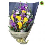 $108 – 5 stalks of Calla Lilies, complemented with Mattiolas, Hypericum berries, Eustomas and Eucalyptus (as shown)