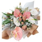 $79 – 3 stalks of Anthuriums complemented by Carnations, dried Phalaris, and foliage (Dusty Miller and Yellow Palm)