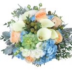 $175 – 6 Roses, 6 Ranunculus, 5 Calla Lilies, Hydrangea, Succulent, complemented with Silver Brunias, Dusty Millers and Eucalyptus leaves.