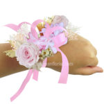 This wrist band features 2 blooms of Preserved mini Roses accented with other dried fillers(Dried Baby’s Breath, Broom Bloom, Ruscus, Ixodia, Hydrangea, etc) and fabric ribbon bow. Fabric strings are provided for you to tie the wrist band to the wrist.