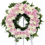 A classic, elegant wreath of understated super Roses with fabric arranged against a peaceful green setting.